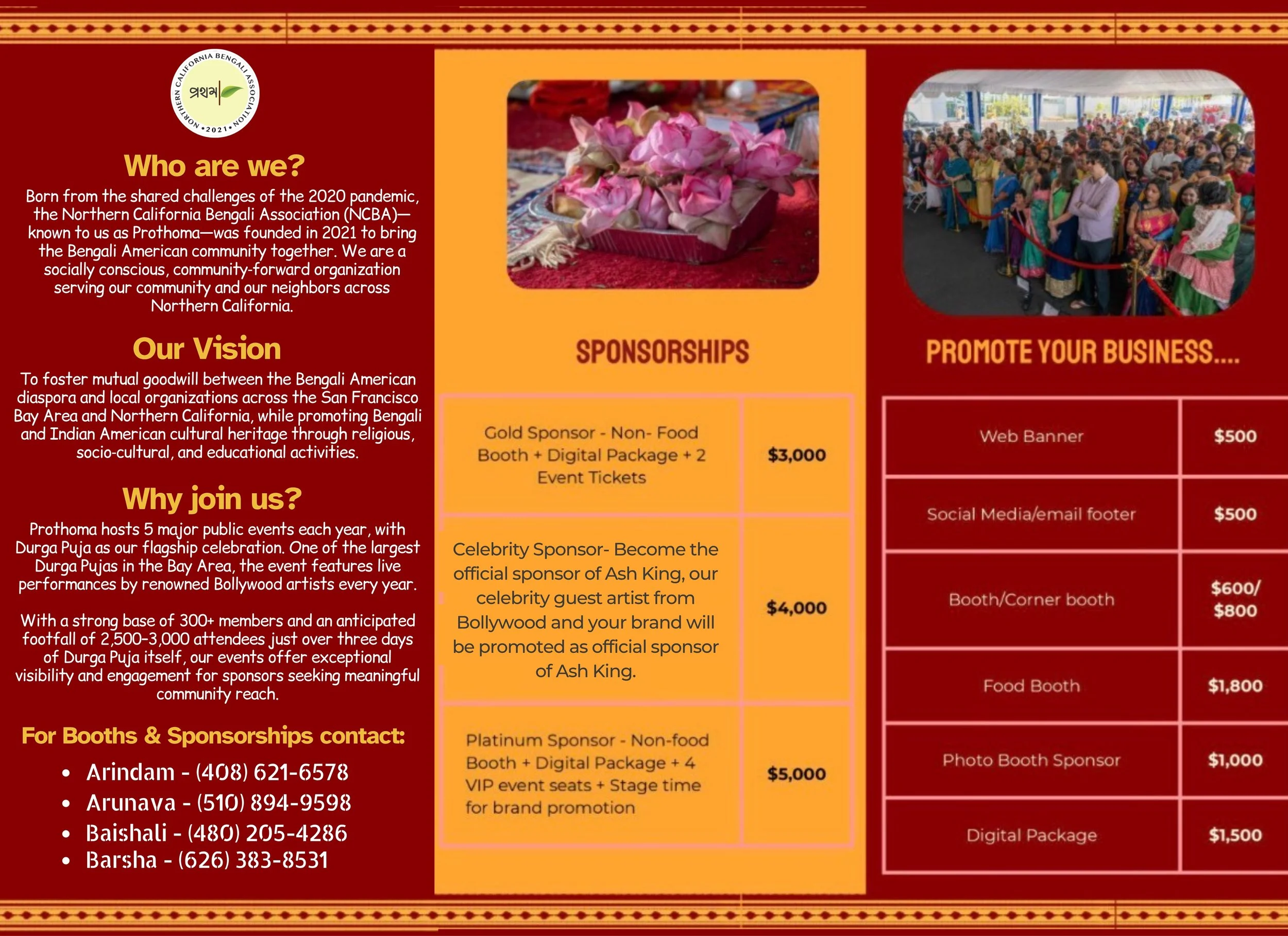 Founded in 2020, in the midst of a global pandemic, Prothoma began as a bold idea: to create a Bengali social and cultural space that felt personal, warm, and rooted in tradition — even during uncertain times. Since then, we’ve continued to grow steadily, winning mindshare not only among Bengalis across the Bay Area, but also within the broader Indian community. Despite thousands of attendees at our events, Prothoma is known for its intimate, welcoming atmosphere — where everyone knows your name and every celebration feels like coming home. Our flagship Durga Puja, along with Barshabaran, Saraswati Puja, Kali Puja, and our annual summer picnic, reflects a unique blend of cultural richness, creativity, and community spirit that sets us apart. Its not too late….